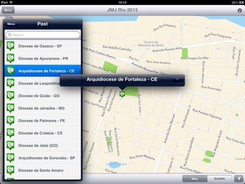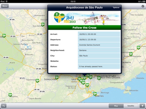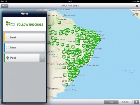 The JMJ Follow the Cross application allows the trajectory of the Cross and the icon of Our Lady to be followed throughout the World Youth Day with the geolocation feature. The route to where the Cross is located can also be shared via Twitter or Facebook. The application is a project developed by WYD Rio 2013.