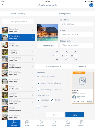 followit agent app v1 allows subscribed agents to push live market updates out to large audiences of qualified leads. Simply pull up one of our easy templates, update the relevant information and send out a notification to everybody following the property. No more cluttered email inboxes or individual text messages. Now you can update the entire market at once at the push of a button!