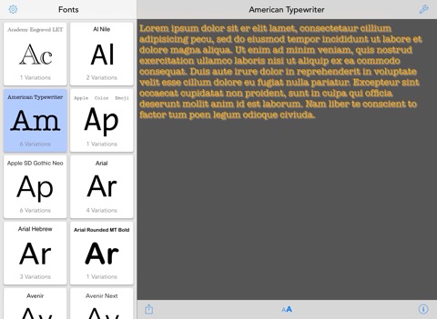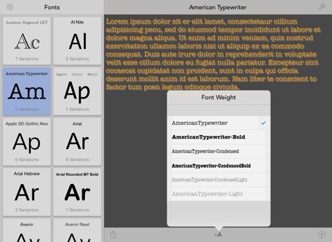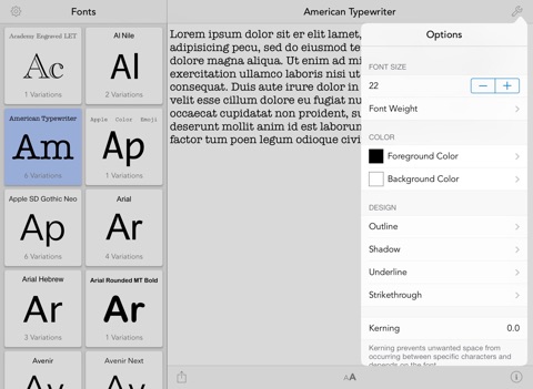 You have a quick overview of all default iOS fonts. You can apply various effects / options to the font such as shadow, underline and strikethrough, kerning, obliqueness or just a simple font and background color. All these options will help you to find the best font for your app.