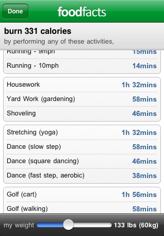 Burn button is an interesting idea. It tells you how long to spend at a list of various activities to burn off that many calories while at a certain weight. The weight is hard to set exactly with a slider. And anyone who would buy this app will be especially sensitive to inputting their exact weight.