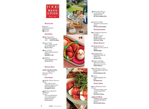 Food Magazine is known and trusted for its kitchen-tested recipes. It offers no less than 30 professionally-tested recipes in its every issue, some of which are analyzed for its nutritional content. Its Food Tour section will allow readers to experience the world through food. Each issue will celebrate the pleasures of the table and the way food connects every individual with family and friends. Food also tackle the Home Basics, from budgeting, decorating, storaging, organizing to cooking tips and techniques.