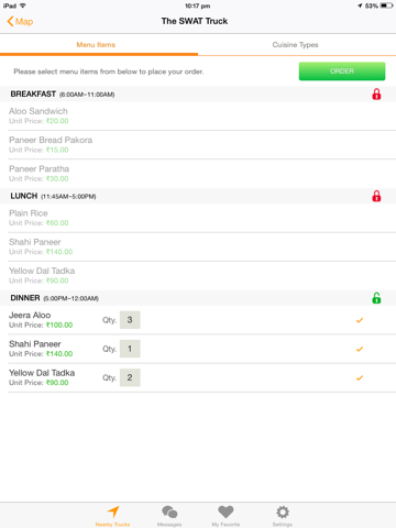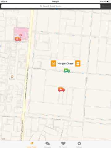 This App provides capability to search food trucks currently serving near your location and display them on the map. Consumers can see the menu and its prices in the local currency and can favorite their food truck for tracking. They can order using mobile from the menu, and can communicate with the vendors using in-built messaging system. Its distance feature allows food truck lovers to find food trucks within the selected distance.