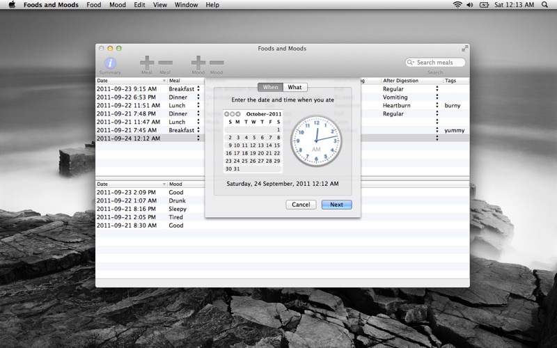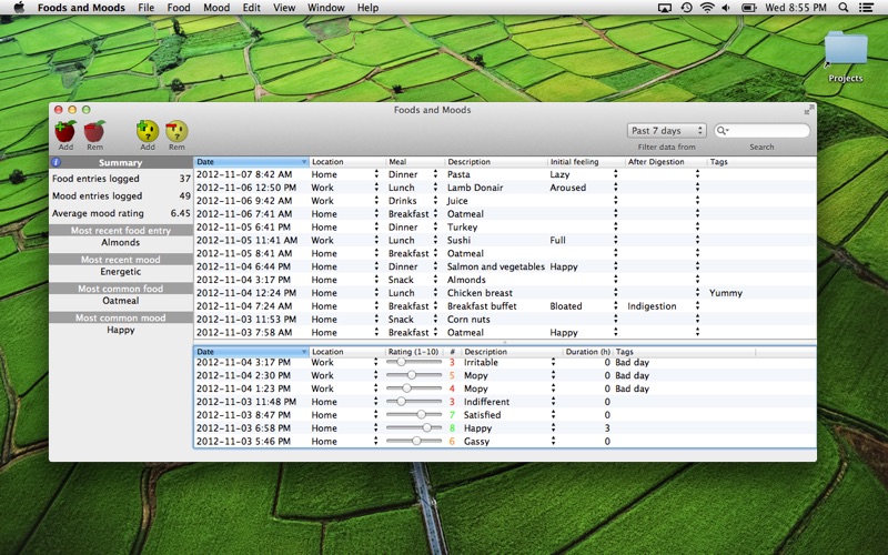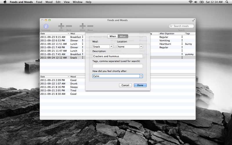 Have you ever wondered what you ate made you feel so bad? Foods and Moods is an application that helps you track just that. It is aimed primarily towards people trying to track which foods may trigger their digestive problems. It does this by keeping two logs: a log of the foods you eat and a log of your moods. This provides you with a searchable history using keywords or "tags", so you may see for yourself if there is any relationship beween the two.