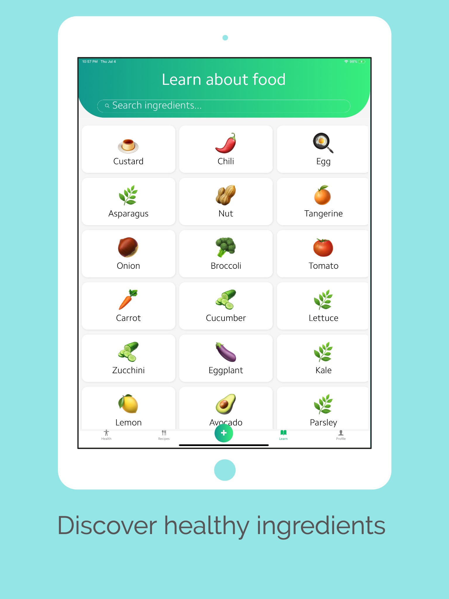 • Find Recipes — Discover healthy recipes for the ingredients you have with cooking instructions and nutrition already calculated.
