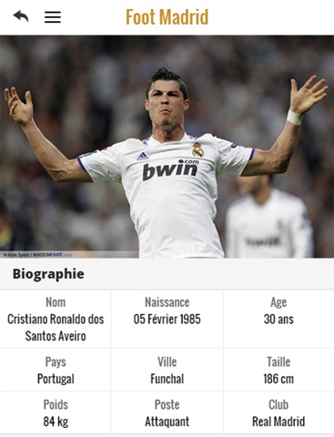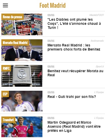 Fan inconditionnel du Real et de ses superstars ? Lapplication Foot Madrid est faite pour vous ! Condensé de toute lactualité qui gravite autour de lécurie madrilène (mercato, compos, interviews, etc) grâce à une sélection des meilleures sources du web, elle vous permet de suivre en temps réel votre club favori : le Real Madrid.
