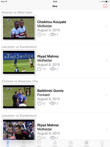 With this app you can quickly find and view the goals of a chosen player or a league. All information is arranged in goals and players that allows to find in no time a player and his goals as well as a tournament’s, team’s and league’s goals.