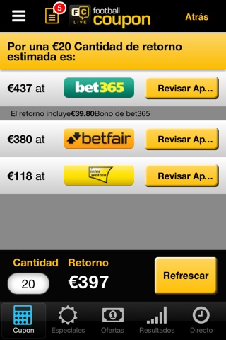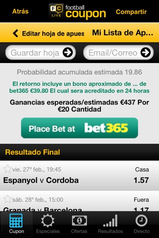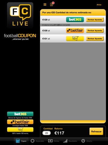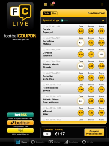 Football Coupon es una forma rápida y fácil de comparar probabilidades para apuestas de Futbol tanto simples como acumuladas y hacer un seguimiento de tus mejores apuestas en tiempo real utilizando información de OPTA.