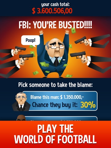 How long will you be able to keep the balls in your court and your blatter full before the FBI catches on to you? Will you be prepared to wear the mask on innocence and sacrifice your team and anyone else you can convince to take the fall for your creative accountancy and repeated bending of the rules? It takes balls to win a soccer game, and you will have to be fearless in your assessment of risks and strategies. Can you do what no other football manager dares to do? Build a sports empire nobody can equal! Climb the ladder of commerce and football management and become the irreplaceable boss of the most famous and important football association in the world!