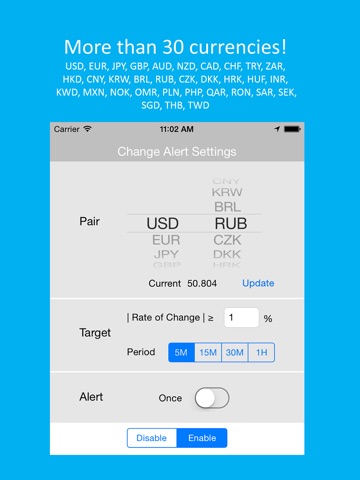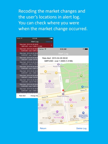 Monitoring the forex rate and the users location in the background. Rate Alert and Change Alert notify market changes. Recording the market changes and the users locations in alert log. You can check where you were when the market change occurred.