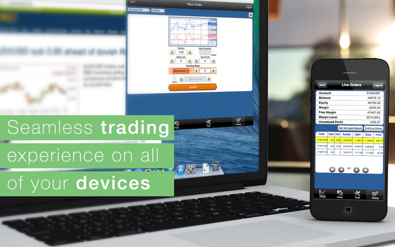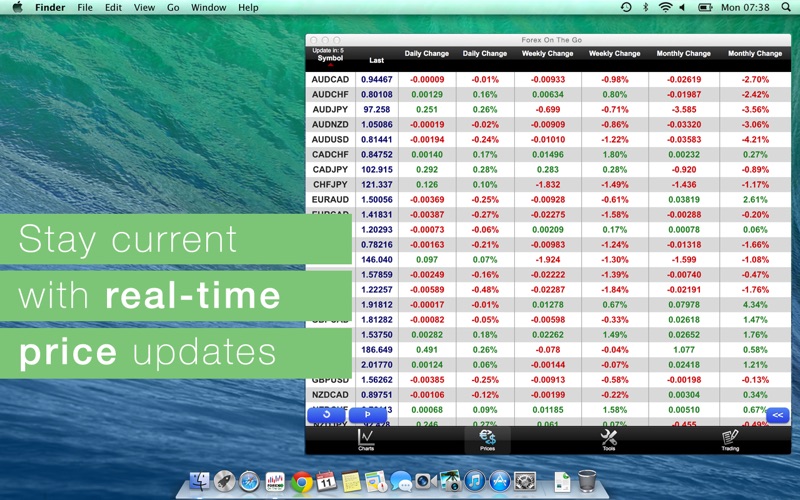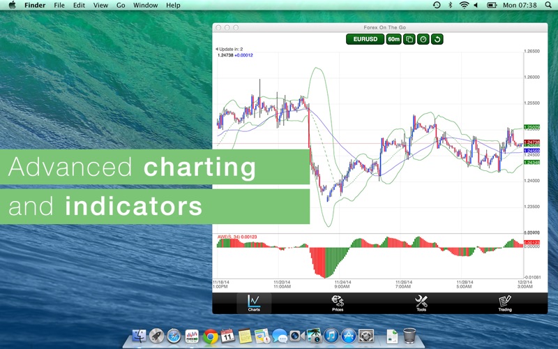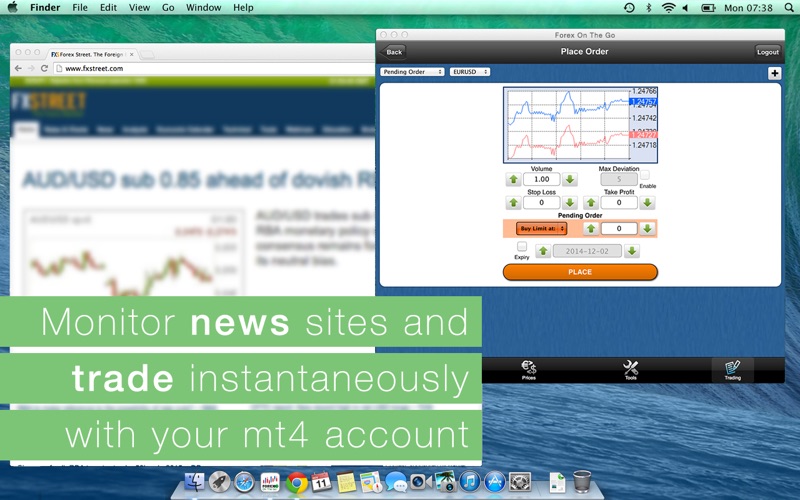 Forex On The Go brings full functionality, MT4 trading through a sleek, optimized interface as well as robust Forex Tools, Charting, News and Pricing - all accessible right from your OS X dock.
