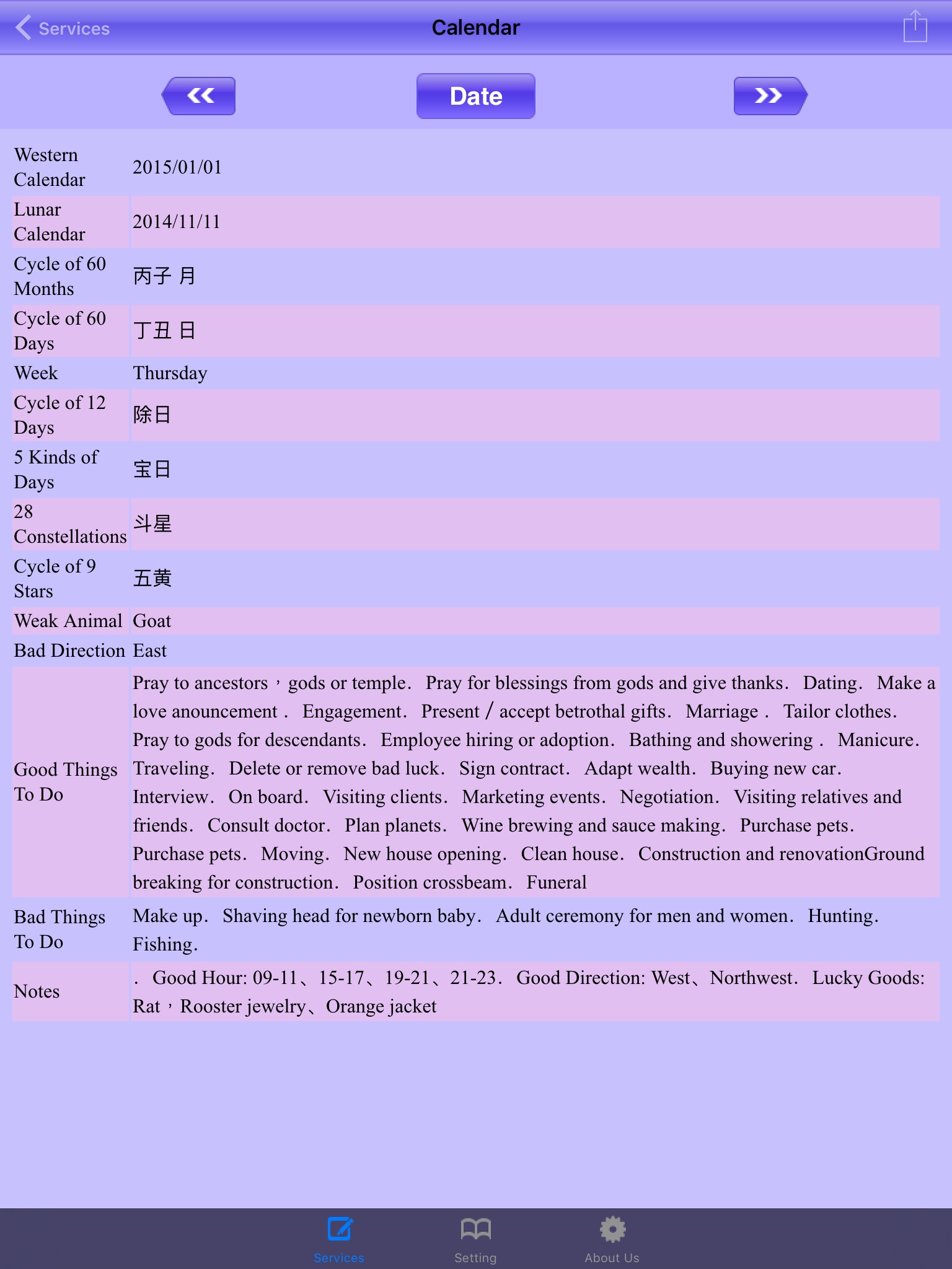 2. The "Lunar Calendar" section provides you with instant advises on the things good or not good to do on each day. The auspicious hours to take note and the directions to avoid on that day. This thus compliments your plan for each day.