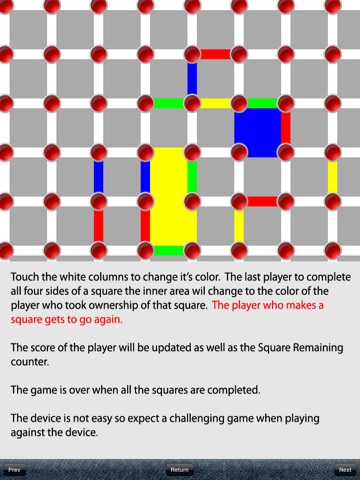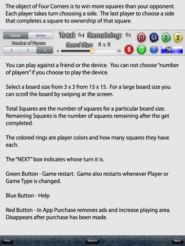 The object of Four Corners is to win more squares than your opponent. Each player takes turn choosing a side. The last player to choose a side that completes a square to ownership of that square.