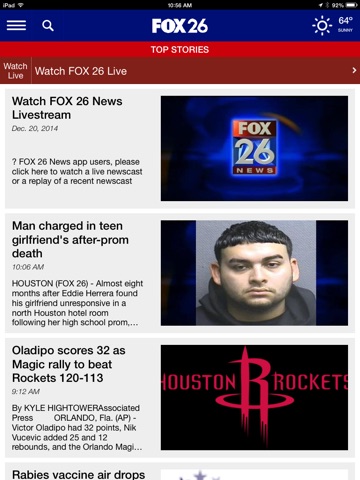I must report that Fox 26 Houstons app is pitiful. Rarely is it up to date with news stories, in fact most days its at least a day behind. You can often find spelling or grammar errors in the stories as well. Dissatisfied in this app.