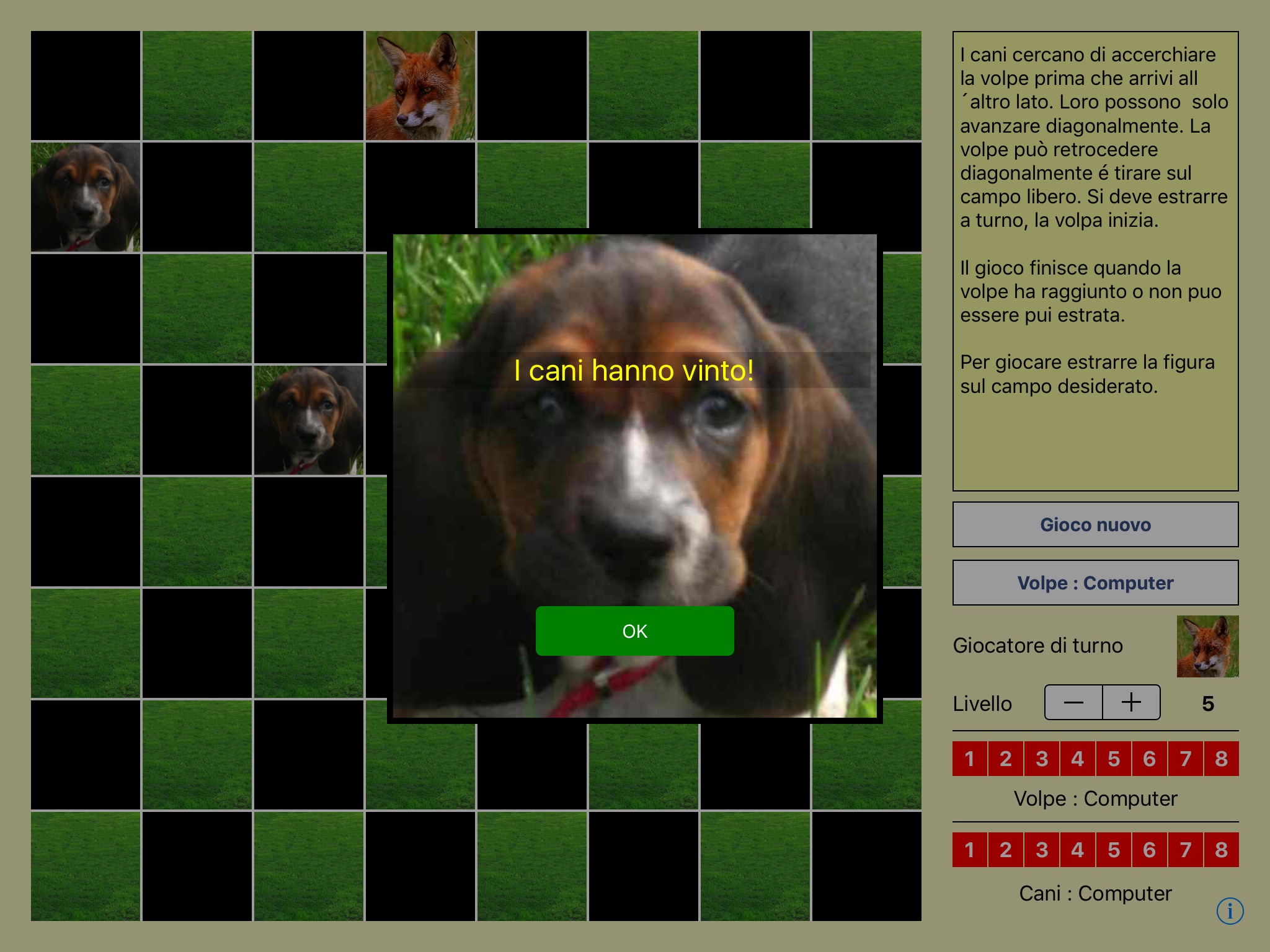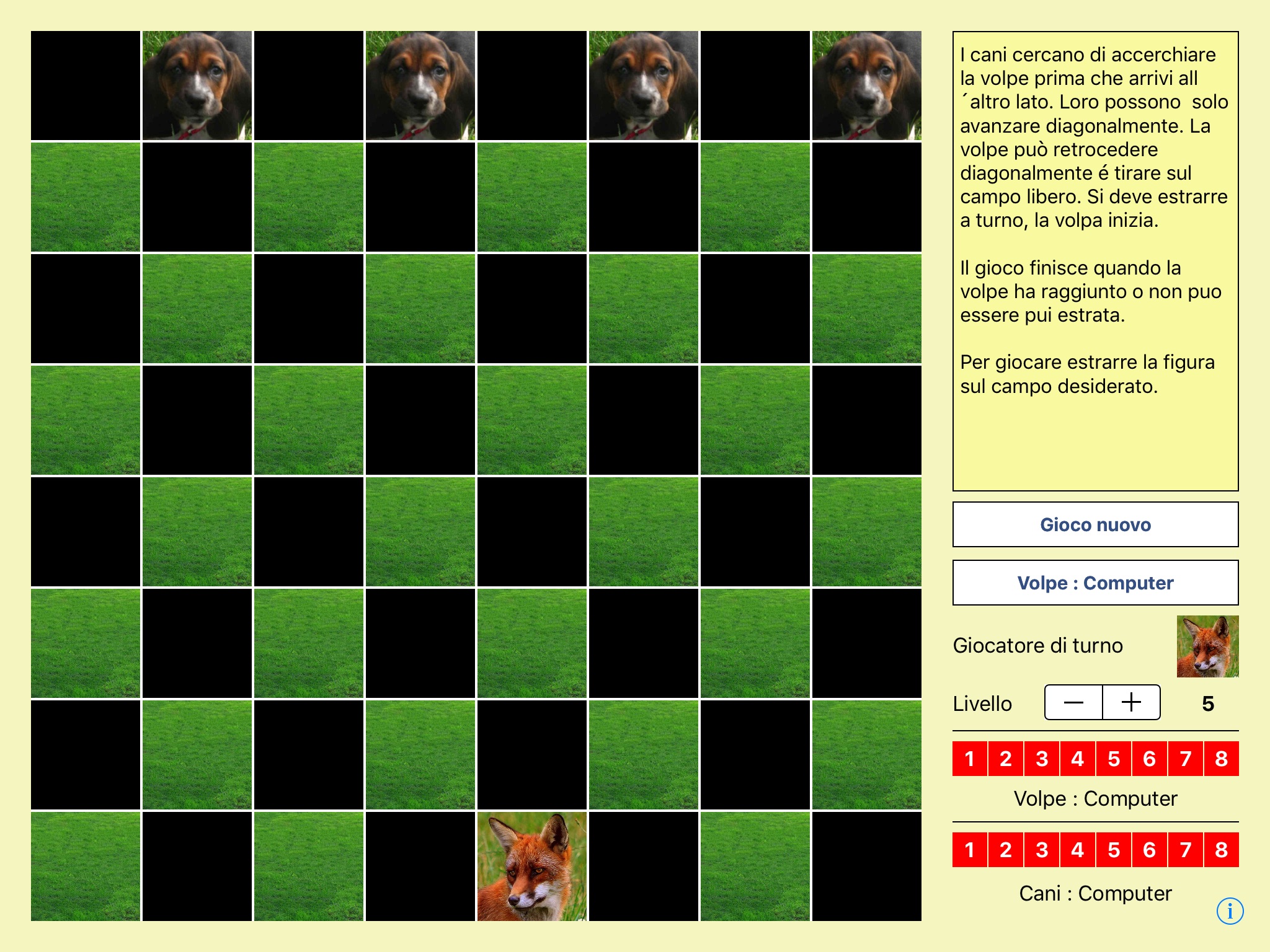 It is played on an 8x8 chess/checkers board. The four hounds try to trap the fox while the fox attempts to reach the other side. The difficulty levels range from easy to challenging. This strategy game is also called "Wolf and Sheep", "Hounds and Hare" or "Devil and Tailors". Easy to play, hard to put down!