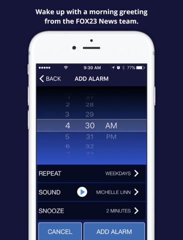 You can even set your alarm to wake you with a morning greeting from FOX23 News This Morning anchors Ron Terrell or Michelle Linn, or meteorologist Michael Seger!