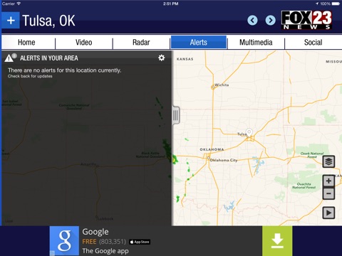 Take FOX23 Weather with you on the go! FOX23 provides Tulsa and the rest of Northeastern Oklahoma with the best coverage of Breaking News and Breaking Weather. Interactive radar zooms down to your neighborhood or zooms out to check conditions anywhere in the country. Live video is available within the app any time FOX23 is broadcasting Breaking Weather Alerts on the air.