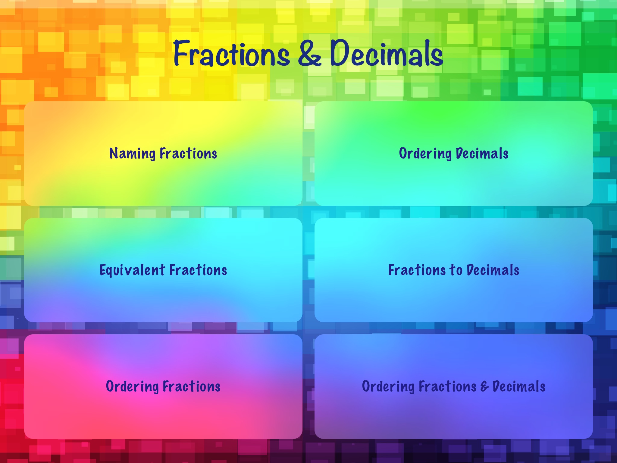 Fractions & Decimals has fun and simple activities to practice a range of fraction and decimal concepts such as: naming fractions, equivalent fractions, ordering fractions and decimals, and equivalent fractions and decimals.