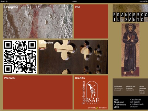 L’app Francesco il Santo è la prima App per iPad realizzata dalla Soprintendenza per i Beni Storici Artistici ed Etnoantopologici del Lazio (BSAE), con lo scopo di promuovere la Cultura dell’Arte anche sulle nuove piattaforme di comunicazione.