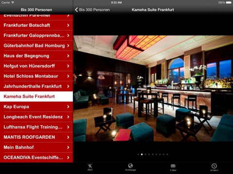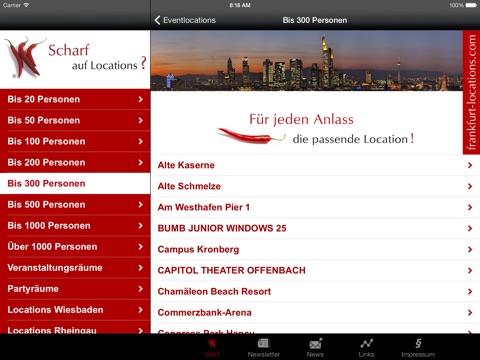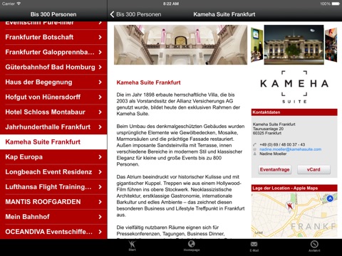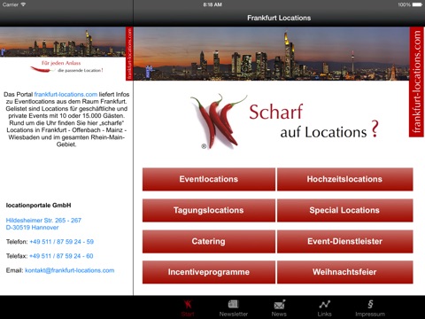 Die App von Frankfurt Locations bietet Information über Eventlocations, Veranstaltungsräume und Hochzeitslocations. Weiterhin sind Tagungshotels und Anbieter für Tagungsräume im Raum Frankfurt, Wiesbaden und dem Rheingau zu finden. Frankfurt Locations unterstützt Sie mit extra auf iPhone und iPad zugeschnittenen App-Versionen bei der Suche nach geeigneten Eventlocations im Großraum Frankfurt. So gelangen Sie schnell und einfach zu der geeigneten Location für Ihren nächsten privaten oder geschäftlichen Event. Haben Sie eine interessante Eventlocation gefunden, können Sie mit einem Tastendruck auf Ihr Smartphone direkt dort anrufen und auch die Kontaktdaten der Location inklusive Ansprechpartner und Mailadresse in die Kontakte auf Ihrem iPhone oder iPad übernehmen. Außerdem ist es möglich, ein von uns vorbereitetes Formular, als Eventanfrage an die ausgewählte Location in Frankfurt zu versenden. So können Sie über verschiedene Wege direkt mit der Eventlocation Ihrer Wahl in Kontakt treten.