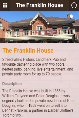 The Franklin House was built in 1855 by William Graydon and Peter Douglas. It was originally built as the private residence of Peter Douglas, who in 1859 went on to sell it to Bennet Franklin, a partner in Barber Brothers Toronto Woollen Mills. Following Franklins death the building remained named "Franklin House". In 1877 the building was converted to a Hotel and Public House which eventually in 1910 under new ownership was renamed "Queens Hotel".
