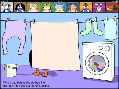 Fred needs help finding his friends in a game of hide-and-seek. Whos that hiding behind the curtains? Is there someone hiding in the closet? And who is actually small enough to fit in the bureau drawer? Point and look for them!