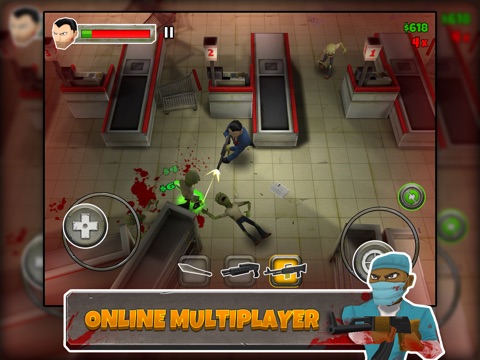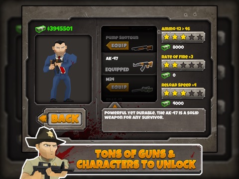 Hire new characters to survive the undead apocalypse. Each character has their own special attributes and traits so you can choose the style of play that works for you or to compliment the skills of your online friends. The Adventurer has quicker reflexes and speed, the Sheriff is better his a sidearm, SWAT has excellent armor but moves slower, and many more survivors to choose from.