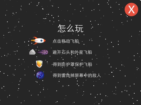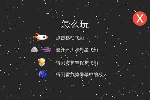 控制飞船避免被石头和外星人砸到,接到防护盾可以抵挡一次石头或外星人的碰撞哦,接到炸弹可以把屏幕中的石头和外星人都炸掉。