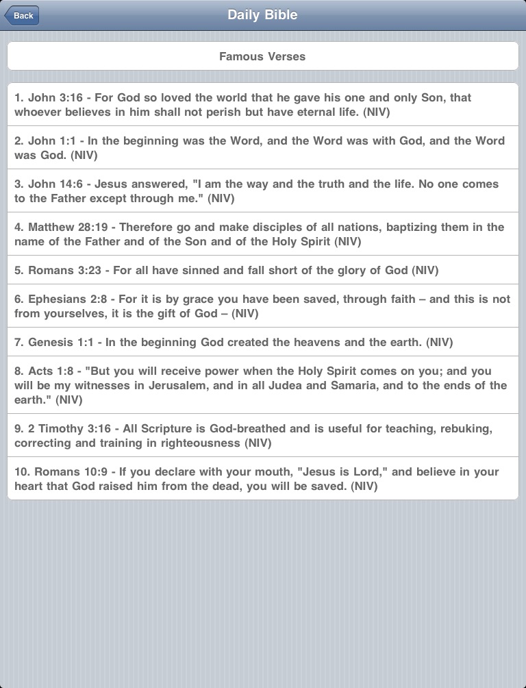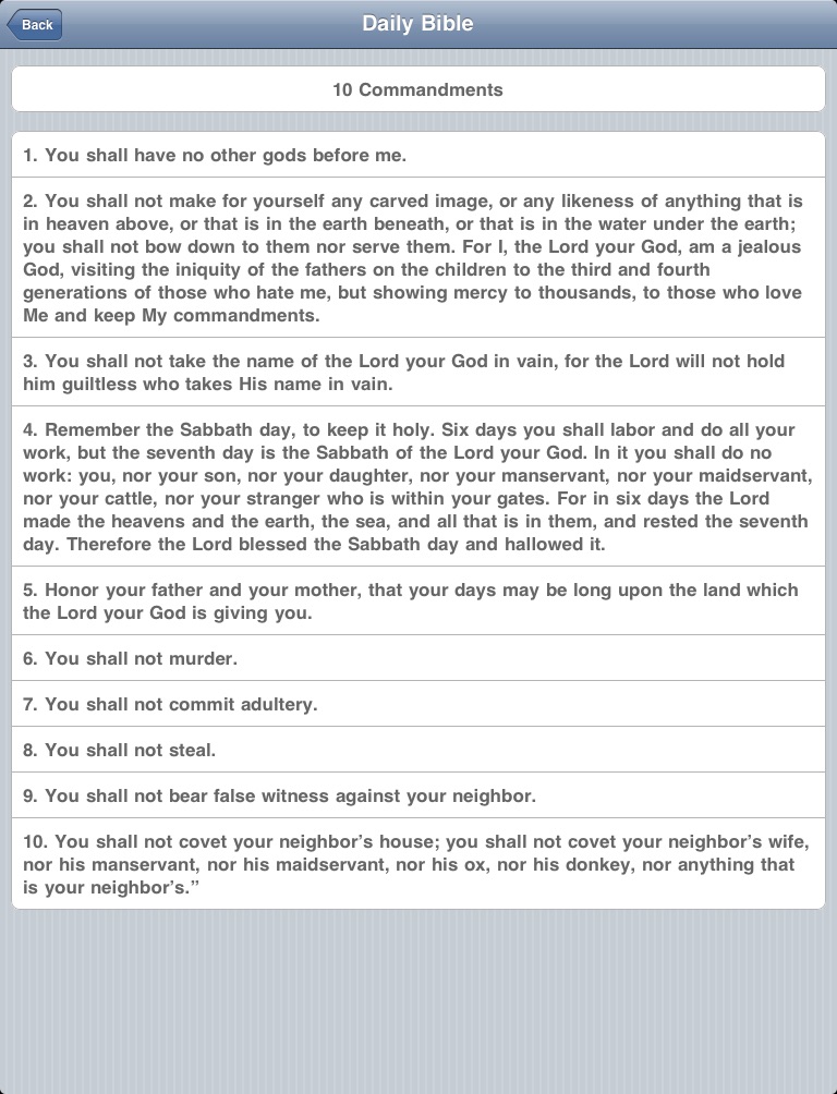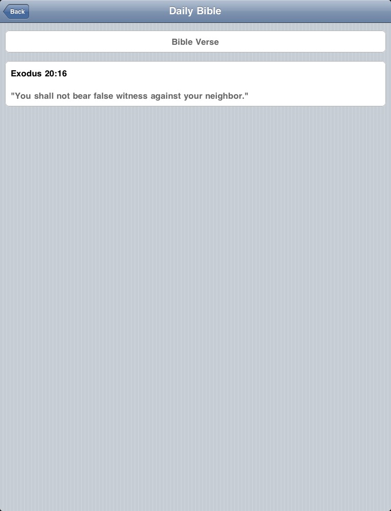 The Free Daily Bible offers a free daily Bible verse, random verses, the Ten Commandments, The Apostles Creed, The Lords Prayer, and some other Famous Verses.