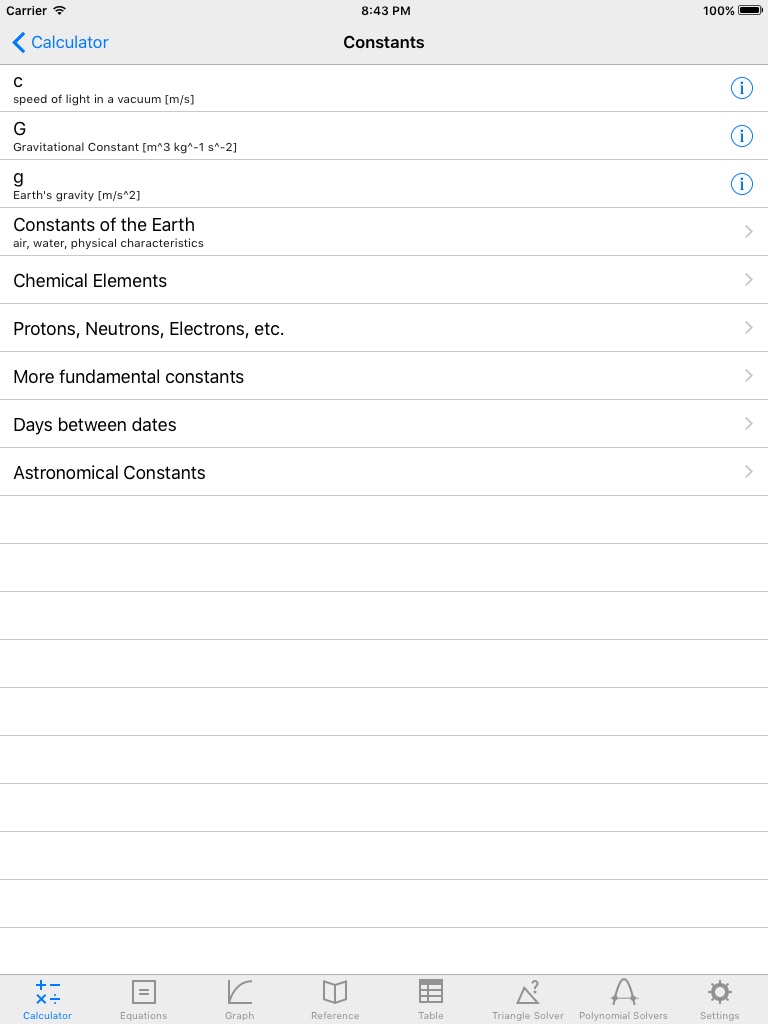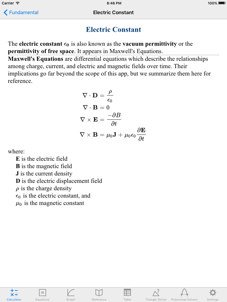 6) Help screens linked directly to many of the available functions and constants. Tap the disclosure arrow to see the definition.