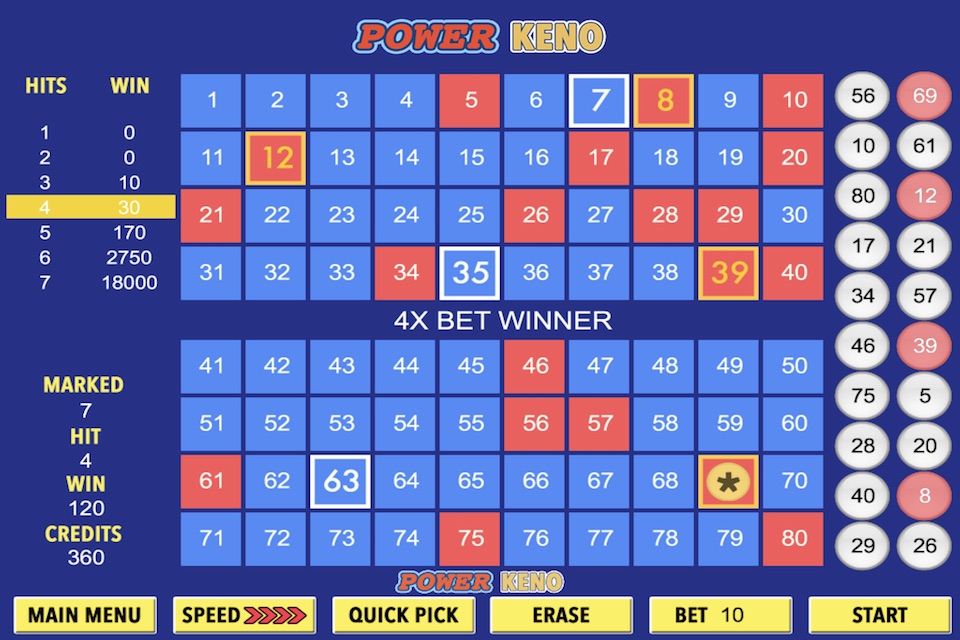 * 4X Bet Win- Play Power Keno for a chance to have winnings quadrupled.