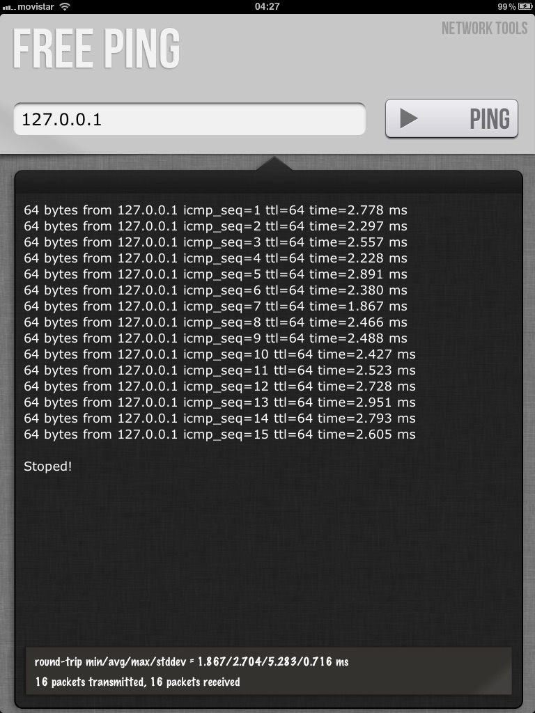 Free Ping es una implementación gratuita del comando ping, para iPad. Además de ser una simple utilidad para ver si hay comunicación con una dirección IP.