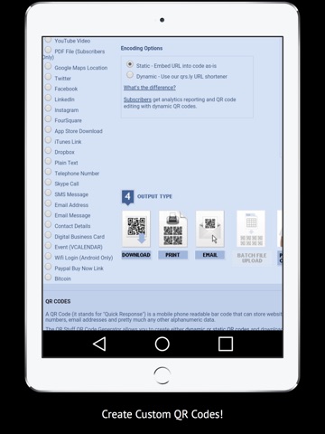 - Create Custom QR Codes from Websites, Social Media Accounts, Emails, Text, Phone Numbers, Skype Calls, Digital Business Cards, App Store Downloads and more.