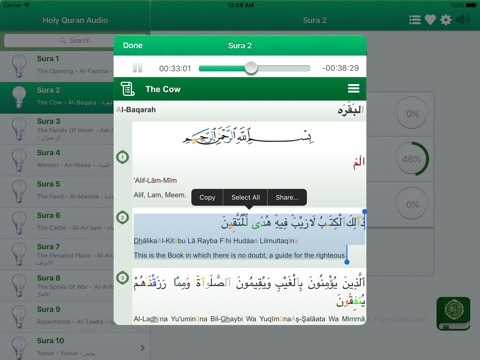 This application gives you the ability to read and listen to all 114 chapters of the Holy Quran on your Iphone or your Ipad.