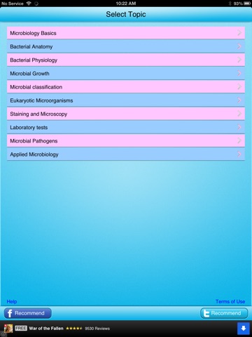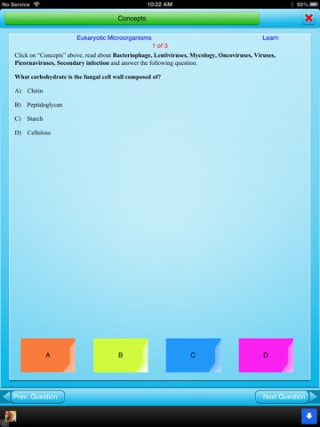 The app allows you to learn Microbiology concepts in a very simple and user friendly manner. In the "Learn" mode of the app, you click on the "Concepts" button, review the "concept text" and then answer multiple choice questions related to the concept that you just reviewed.