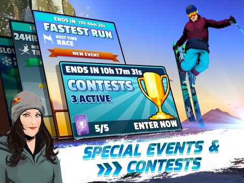 Compete in powder, race and trick contests and take part in special, limited-time skiing events. Climb up the leaderboards with single-player and PvP competitions.