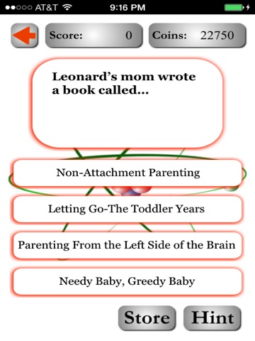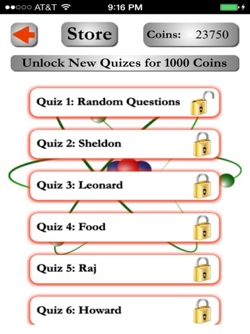 The game starts with a quiz on random Big Bang Theory topics. You earn points and coins for each question you answer correctly. The coins are used to buy hints and unlock more quizzes. The points are totaled up and are posted to Game Center. You also earn achievements for scoring 5000 points on a single quiz.