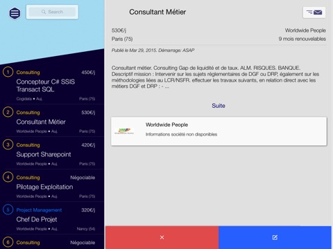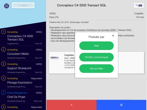 Vous pouvez candidater directement dans lapplication. Vous pouvez vous envoyer le détail de la mission par mail et bientôt la possibilité de répondre directement depuis lappli.