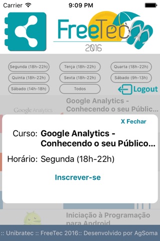 No aplicativo é possível ver agenda do evento como também é possível fazer sua inscrição e visualizar sua agenda.