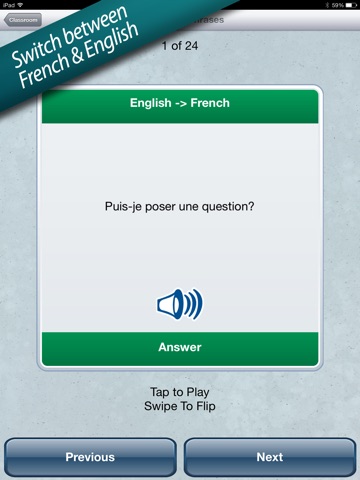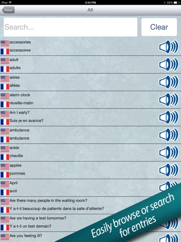 • Hear over 700 everyday words and phrases spoken aloud in English and French