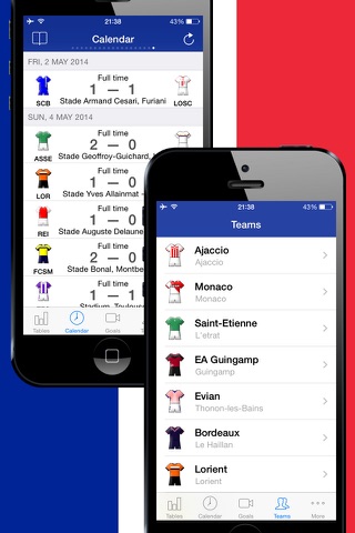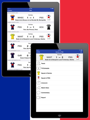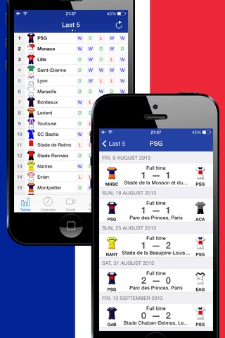 Using "French Football League 1 History 2012-2013" you also get an immediate access to the Tournament table, Schedule, Teams, Events in Matches, News and Statistics.