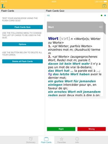 Les fonctions apportées par lapplication ne justifient pas le prix élevé. Le dictionnaire est certes plutôt complet même sil est loin dêtre aussi détaillé quun bon dictionnaire papier. La description (copie décrans) peut laisser penser que le dictionnaire fournit les différentes formes des mots dans les deux langues, or il ne les fournit quen français. Il dispose dun outil de quizz à partir des mots consultés mais cet outil est extrêmement limité et ne permet pas, par exemple, de spécifier une acception donnée ou denregistrer une expression complète. Pour un allemand apprenant le francophone, il est probable quil mérite 4 étoiles. Pour un français, il nen mérite selon moi pas plus de 3.