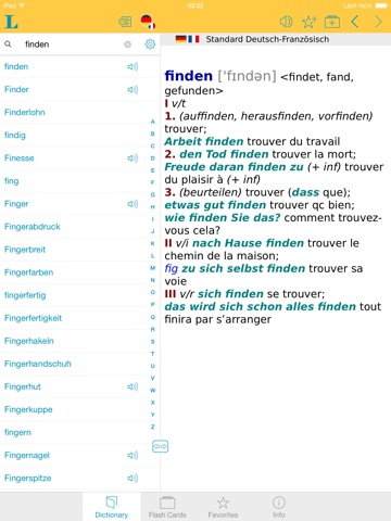 Mit der Installation des Wörterbuchs Deutsch/Französisch "Standard" von Langenscheidt für 30 Euro, glaubte ich gut bedient zu sein. Weit gefehlt, jede Menge Begriffe welche ich in der Zeitung lese, jedoch nicht verstehe, sind in dem App nicht enthalten - möglicherweise hätte ich die Version "pro" zu 40 Euro herunterladen sollen!? Werde mein Geld jedoch nicht weiter zum Fenster heraus schmeissen und verzichte darauf!