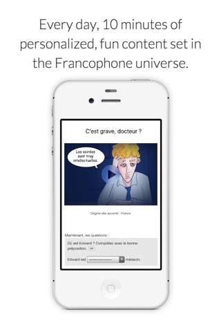 Personalized French Content: Frantastique lessons are based on your needs, your requests, and your level. You’ll come across professional scenarios, a variety of accents, exercises and plenty of humor. 10 to 15 minutes daily is all it takes!