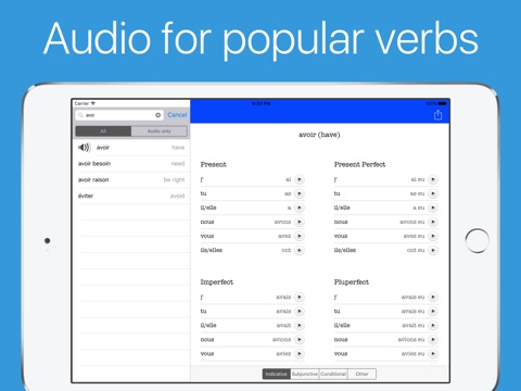 Filter wären toll, zb. die 50 häufigsten Vokabeln oder alle Vokabeln wo es Audio zu gibt. So sehr unübersichtlich da einfach nur lange Liste. Gut wäre auch eine deutsch Übersetzung bei den Zeiten.