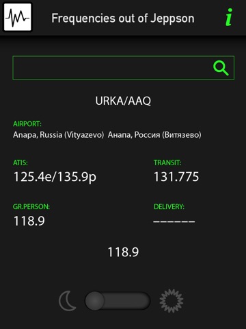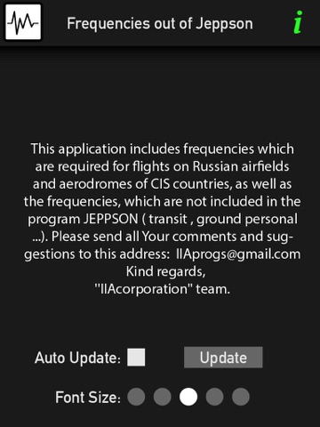 This application includes frequencies which are required for flights on Russian airfields and aerodromes of CIS countries, as well as the frequencies, which are not included in the program JEPPSON ( transit , ground personal ...). Please send all Your comments and suggestions to this address: [email protected]