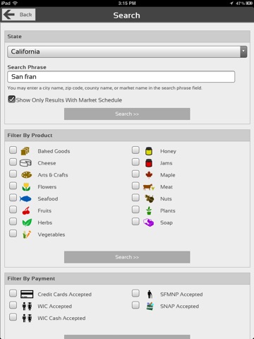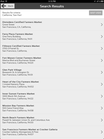 The Fresh Food Finder is the easiest way to locate farmers markets and locally grown food wherever you may be. The Fresh Food Finder enables you to easily find markets near your current location, or easily search for farmers markets within a state, city, or zip code. Only Farmers Markets that are registered with the FDA will be found by this app.