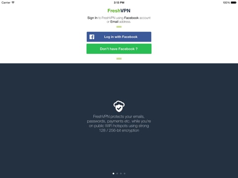 * Secure - FreshVPN protects your emails, passwords, payments etc. while youre on public WiFi hotspots using strong 128 / 256-bit encryption.
