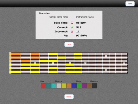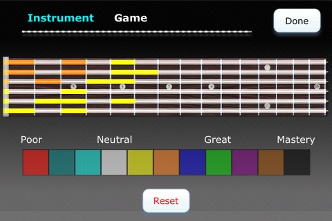 Interface simple et agréable. Bonne représentation graduelle des progrès enregistrés, rendant captivant le défi datteindre le niveau de maîtrise complète du manche (ou des frets sélectionnés) ! - Manque le Ukulele parmi les instruments. -