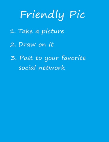 Allows a person to take a picture and mark it up with different line and colors. This app is an introduction to the Friendly Pic, that allows you to submit your pics to social networks like Facebook and Twitter. Friendly Pic Basic is limited to just sending the pic via email.