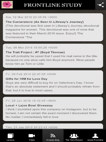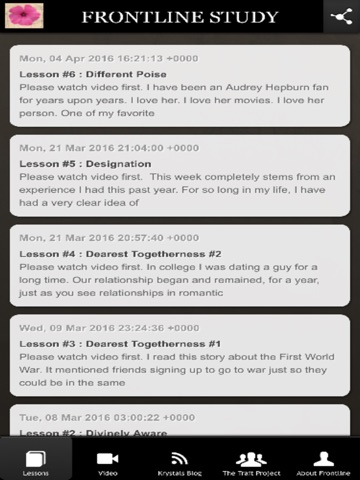 Authored by Krystal Ribble, Frontline is a Bible study for college women. Using videos and text, Krystal takes the user through the book of Ecclesiastes in a seven lesson series. Krystal guides the reader using her personal life experiences and scripture to help college girls put life into perspective. Frontline can be completed alone, but as Krystal ends each lesson with questions, group study and dialogue is strongly encouraged. Lessons include: Introduction, 1. Dirty Boots; 2.Divinely Aware; 3.Dearest Togetherness pt. 1; 4. Dearest Togetherness pt. 2; 5. Designation; 6. Different Poise; 7. Dialogue